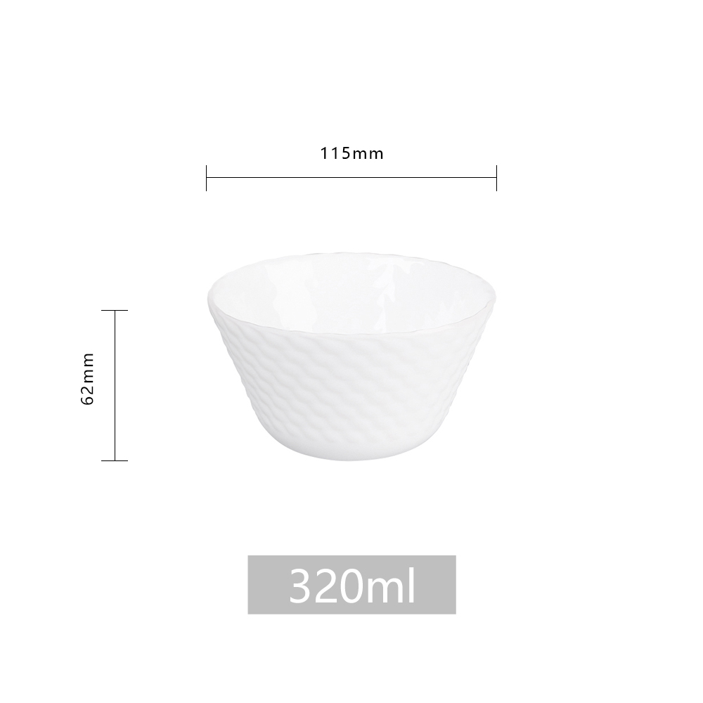 Inch:4.50 Diameter:115mm Width:115mm Depth:115mm Height:62mm Volume:320ml Material:Opal Use:Individual Bowl Microwave Safe:Yes Dishwasher:Yes