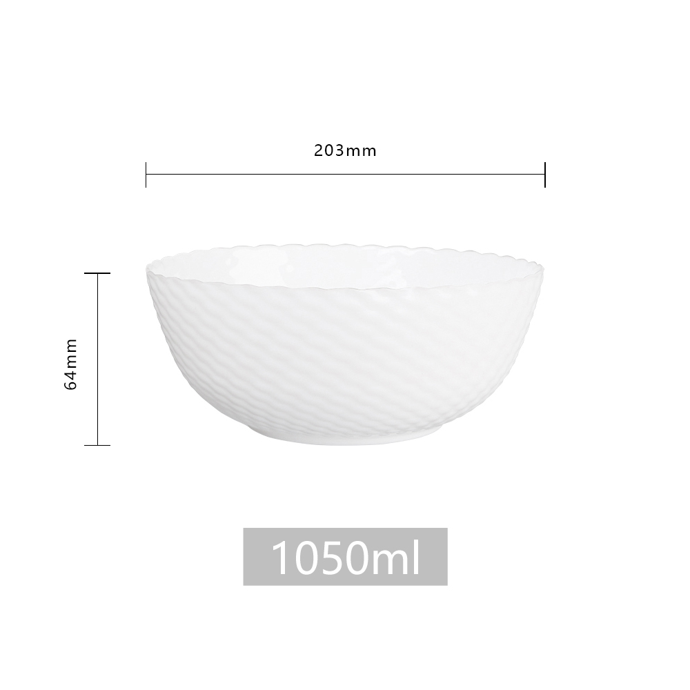 Inch:8.00 Diameter:203mm Width:203mm Depth:203mm Height:64mm Volume:1050ml Material:Opal Use:Salad Bowl Microwave Safe:Yes Dishwasher:Yes