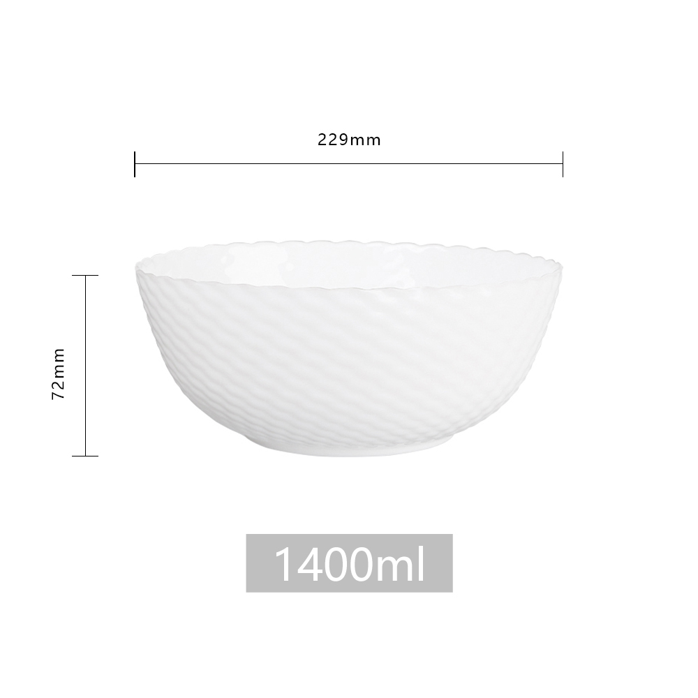 Inch:9.00 Diameter:229mm Width:229mm Depth:229mm Height:72mm Volume:1400ml Material:Opal Use:Salad Bowl Microwave Safe:Yes Dishwasher:Yes