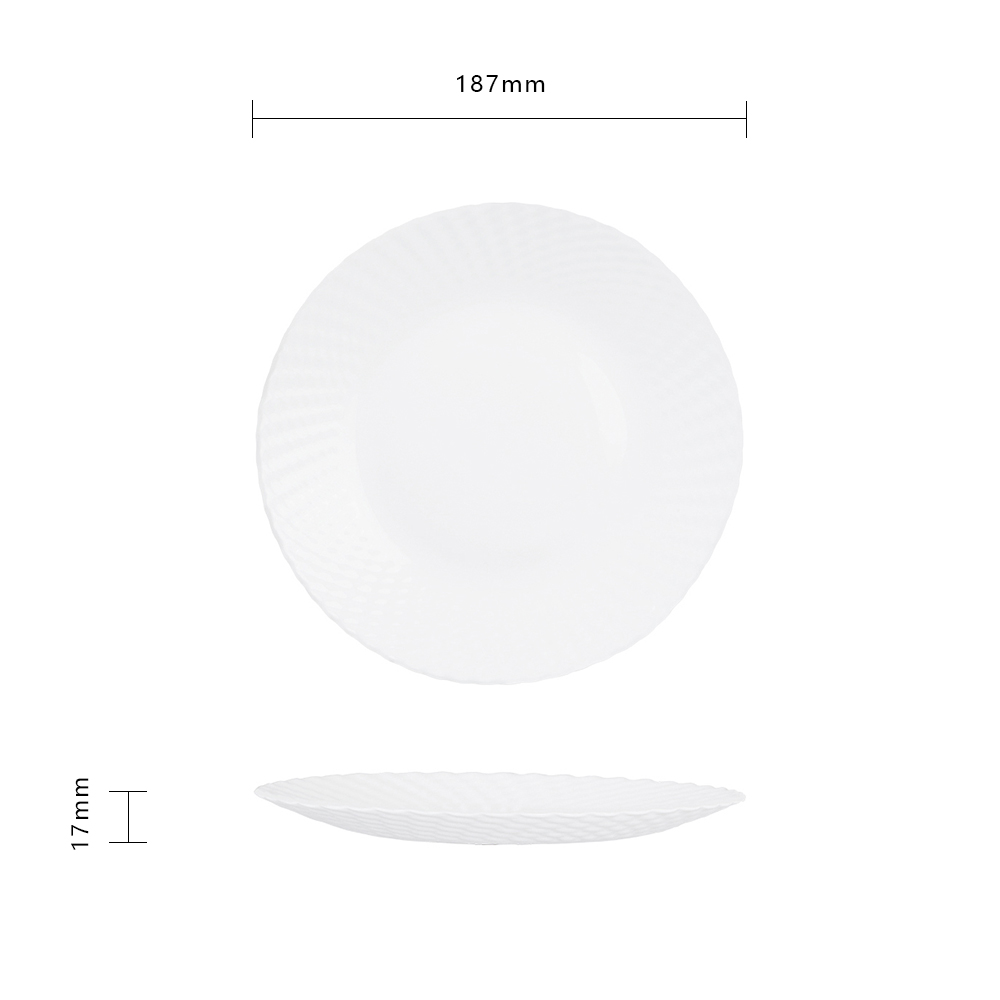 Inch:7.25 Diameter:187mm Width:187mm Depth:187mm Height:17mm Volume:0ml Material:Opal Use:Dessert Plate Microwave Safe:Yes Dishwasher:Yes