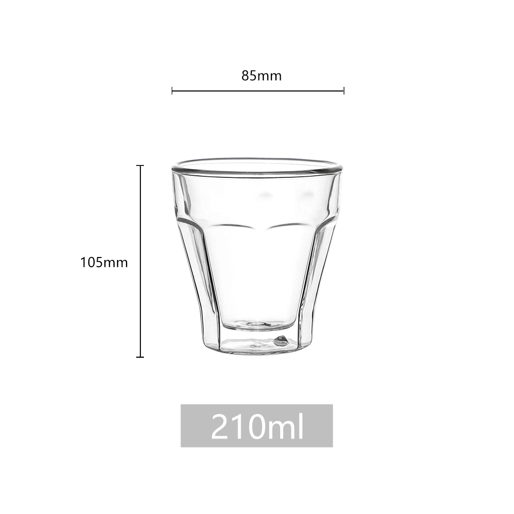 High borosilicate glass is non-toxic, BPA-free, and resistant to chemical corrosion. The double-wall design provides excellent insulation, keeping hot beverages hot and cold beverages cold for longer.Φ85x H105mm,210ml