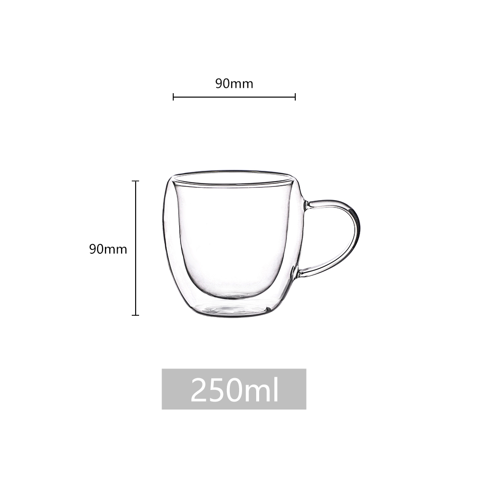 High borosilicate glass is non-toxic, BPA-free, and resistant to chemical corrosion. The double-wall design provides excellent insulation, keeping hot beverages hot and cold beverages cold for longer.Φ90x H90mm,250ml