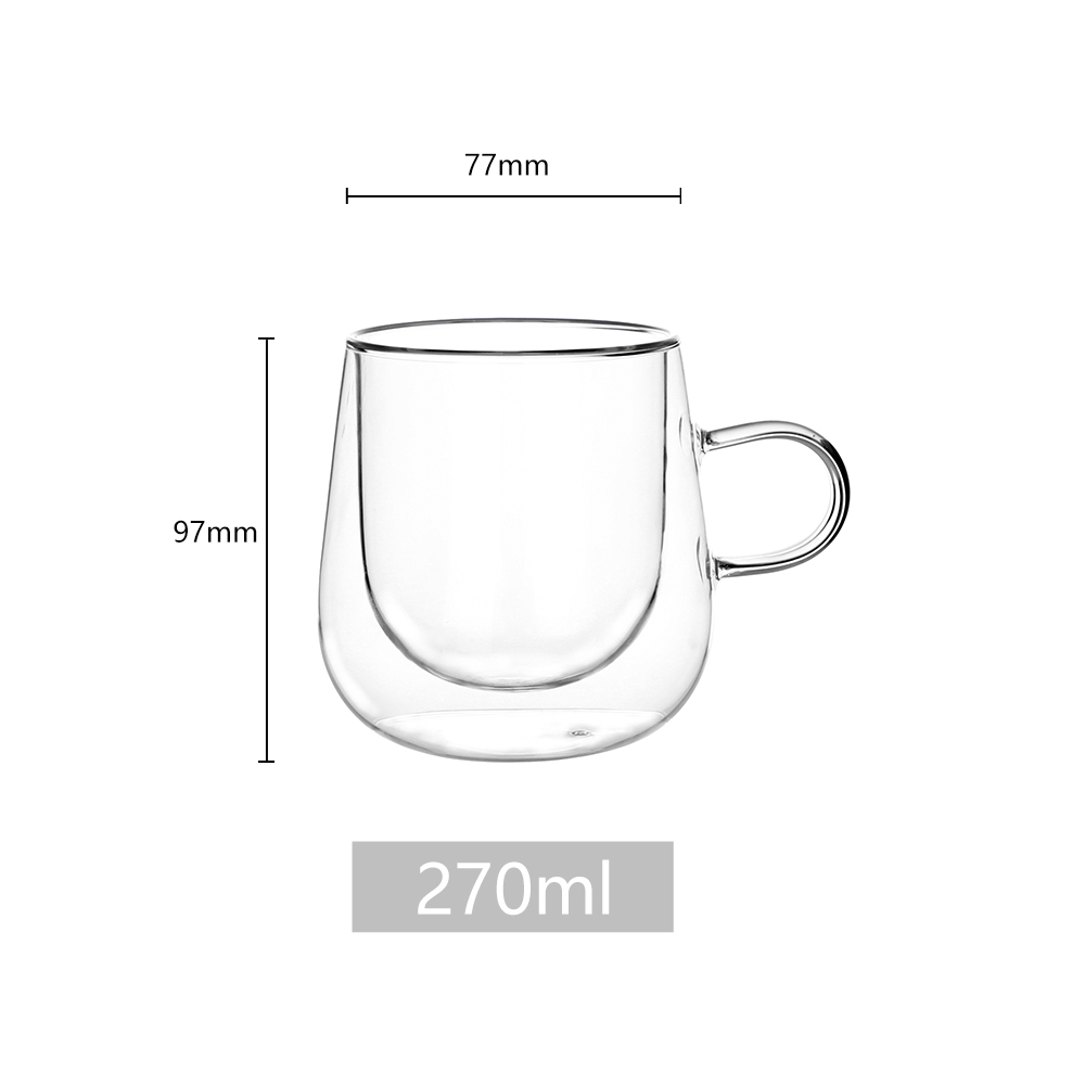 High borosilicate glass is non-toxic, BPA-free, and resistant to chemical corrosion. The double-wall design provides excellent insulation, keeping hot beverages hot and cold beverages cold for longer.Φ77x H97mm,270ml