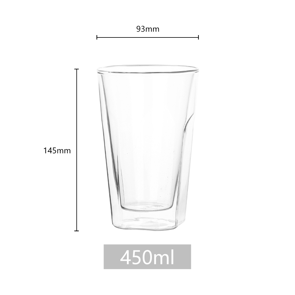High borosilicate glass is non-toxic, BPA-free, and resistant to chemical corrosion. The double-wall design provides excellent insulation, keeping hot beverages hot and cold beverages cold for longer.Φ93x H145mm,450ml
