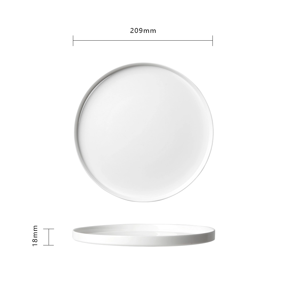 Modern 8″ dessert plate featuring the High Edge signature profile. High-gloss finish, ideal for professional food presentation.